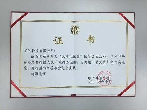 第六屆“大愛無國界”公益活動由王毅外長夫人錢韋女士發(fā)起,其宗旨是凝聚中外各界愛心,幫扶貧困地區(qū)人民和社會弱勢群體改善生活。在2014年10月19日舉行的國際義賣活動中,保利科技捐款20萬元人民幣。參與此項公益活動,是公司為我國慈善事業(yè)做出的又一項積極貢獻。