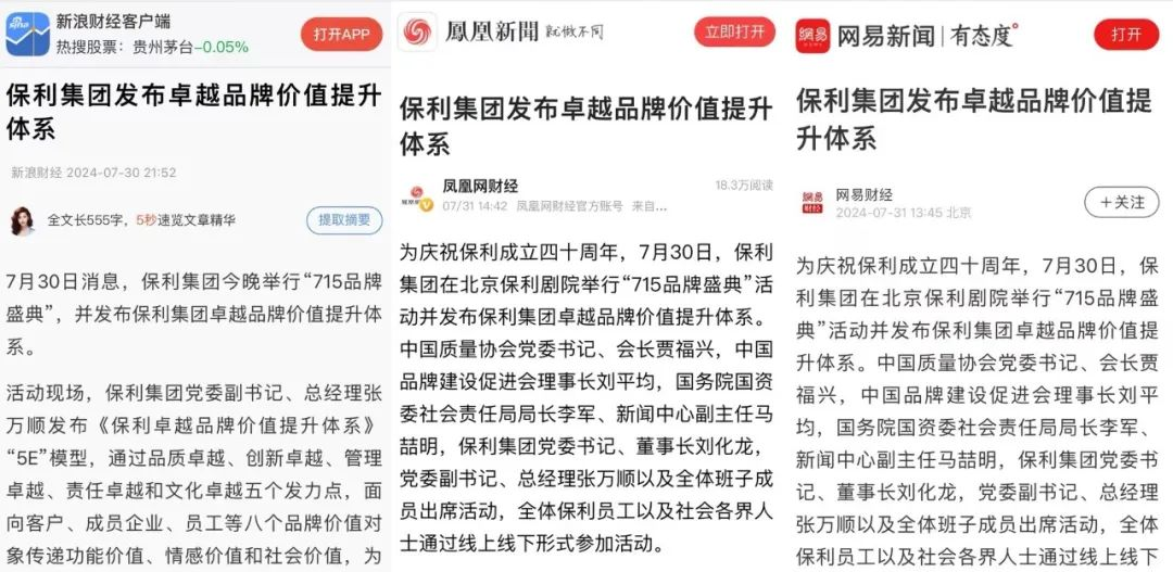 聚焦品牌盛典活動盛況。人民日報發(fā)布整版版面《有為跨山海?卓越向未來》,凸顯保利堅守初心、服務家國的企業(yè)標識;人民網進行首頁焦點圖輪播并發(fā)起“7·15品牌盛典”云直播。此外,光明日報、經濟日報、中國日報、中國青年報等數(shù)十家權威主流媒體和鳳凰新聞、網易新聞、新浪財經各類行業(yè)媒體累計曝光數(shù)據近3000萬,充分肯定了保利胸懷“國之大者”,帶動行業(yè)發(fā)展的引領性、示范性。