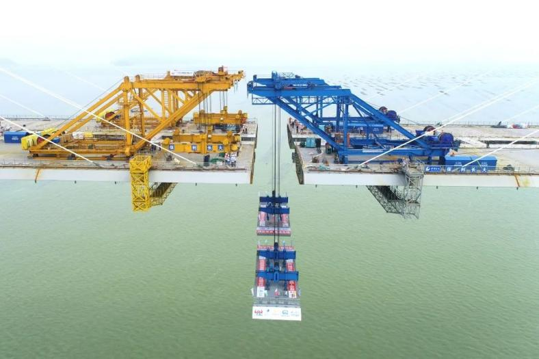 黃茅海大橋是項(xiàng)目的關(guān)鍵工程,保利長大承擔(dān)了100個(gè)梁段、近3.6萬噸重的鋼箱梁吊裝施工。面對臺風(fēng)季的頻繁影響,項(xiàng)目團(tuán)隊(duì)采用三維動畫模擬技術(shù)保障精準(zhǔn)吊裝,利用高精度測量機(jī)器人高效觀測安裝動態(tài),最終以兩毫米內(nèi)誤差完成最后一榀鋼箱梁吊裝,助力打造世界跨徑最大三塔公路斜拉橋。